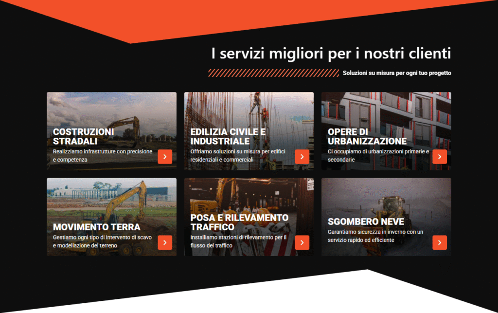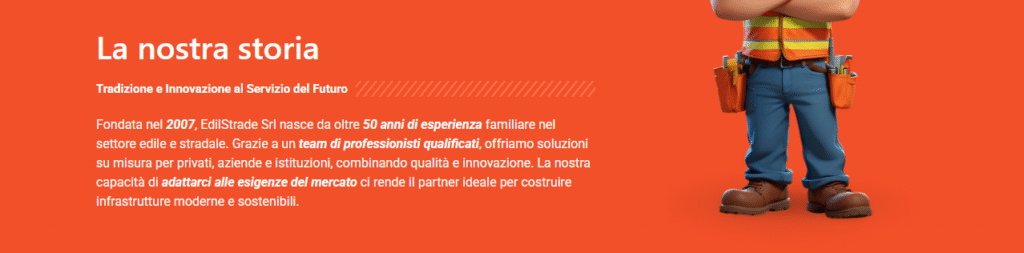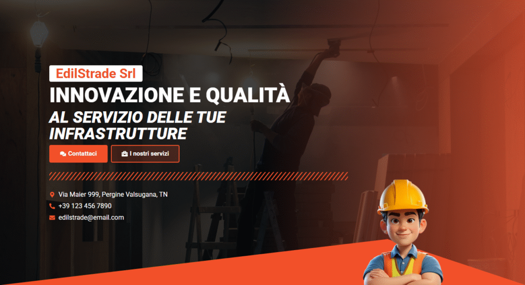 Ho scelto un’immagine di cantiere in trasparenza scura per dare profondità e un tono professionale. Il testo in grande evidenzia slogan e mission, mentre i pulsanti “Contattaci” e “I nostri servizi” in rosso guidano subito l’utente verso le azioni principali. La mascotte con casco aggiunge un tocco amichevole e distintivo.