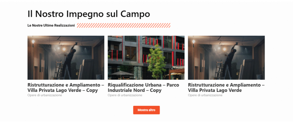 Le card progetto mostrano foto reali di lavori completati con titolo e categoria. L’uso delle linee diagonali rosse mantiene coerenza grafica con l’identità del sito e richiama dinamicità.